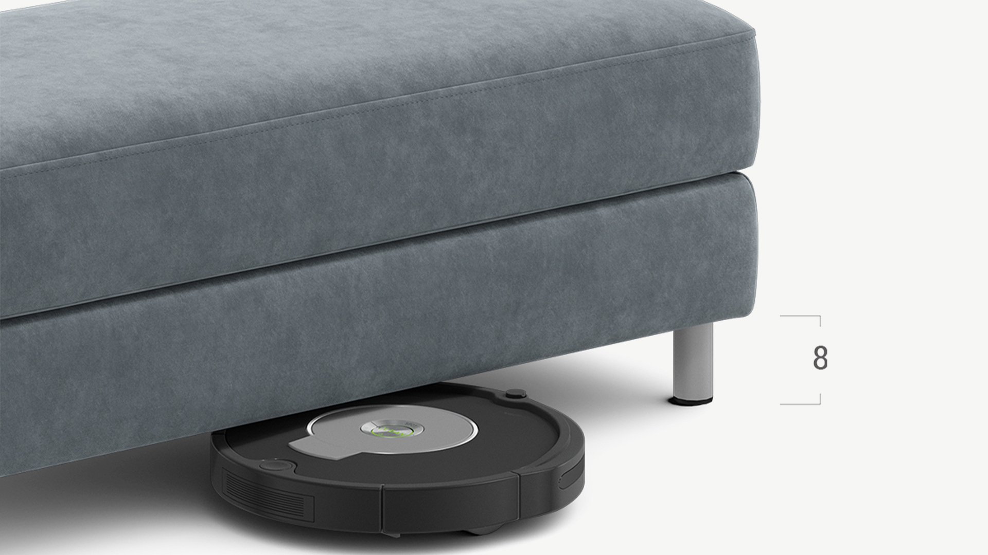 Под банкеткой с высокими цилиндрическими опорами проходит робот-пылесос.
