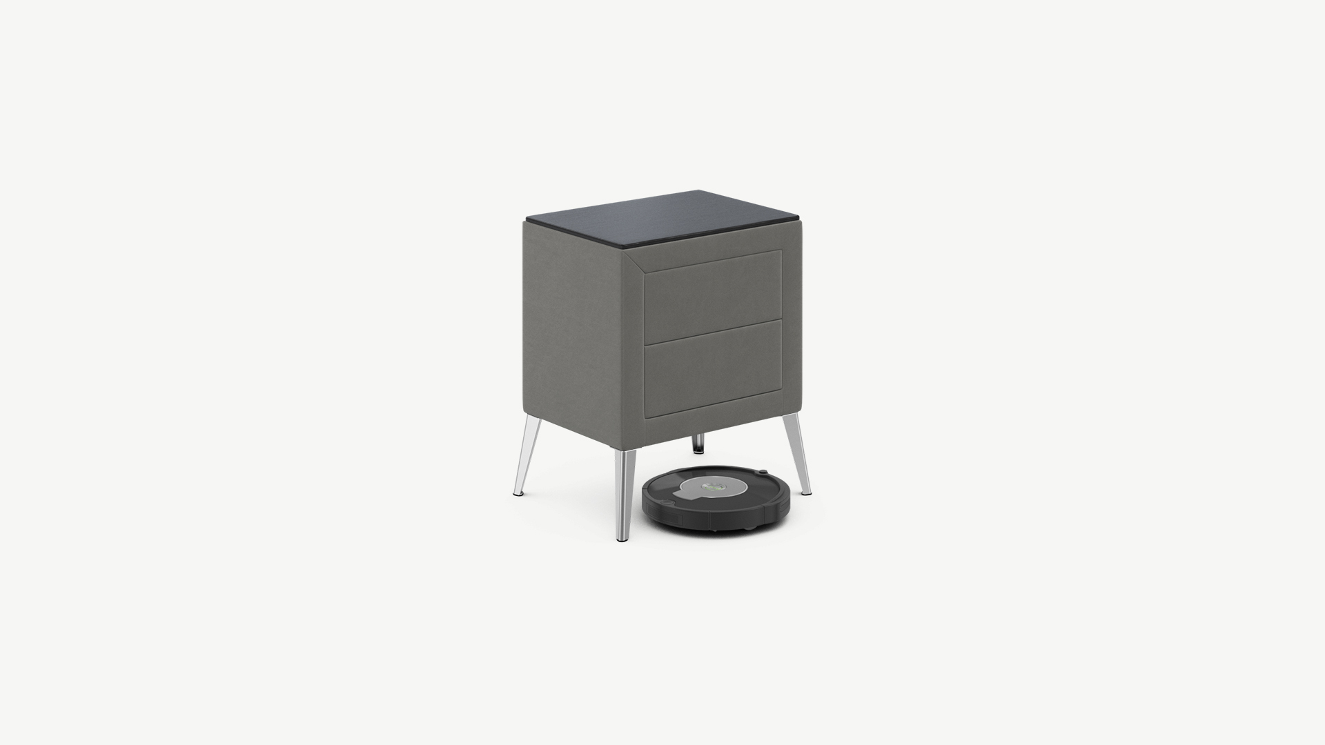 Обратная сторона тумбы, выполненная в обивочной ткани, позволяет ставить ее в центре комнаты и зонировать пространство.