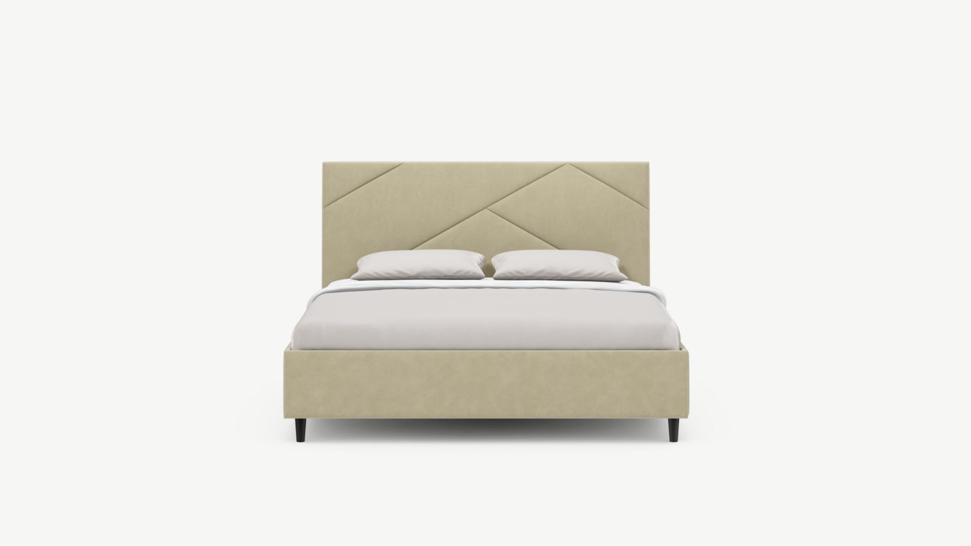 MOON FAMILY 1257 привлекает внимание оригинальным исполнением: широкие полосы ткани эффектно пересекают периметр изголовья, создавая на нем графический орнамент. Лаконичные формы объемных царг создают единый гармоничный образ и фокусируют внимание на центральном текстурном элементе кровати.