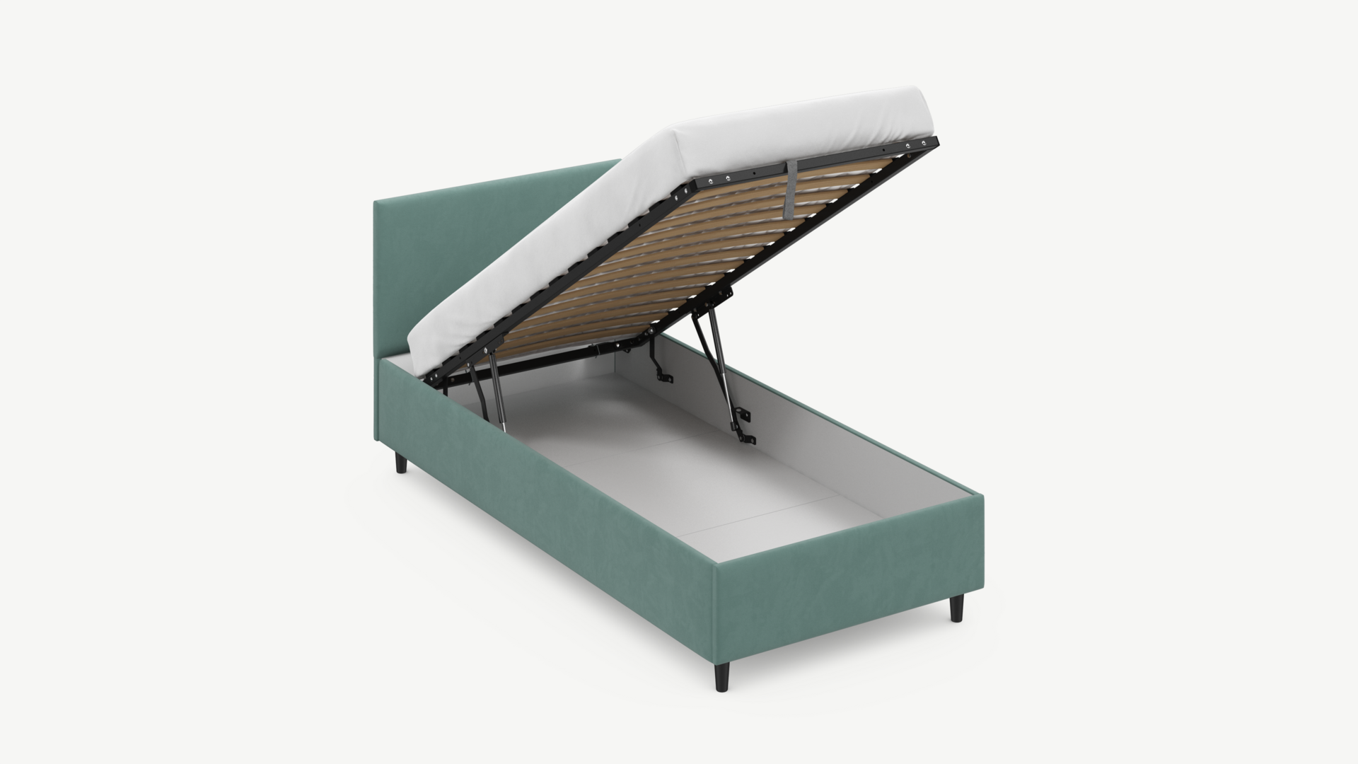 Вместительная емкость под кроватью без внутренних перегородок позволяет использовать для хранения вещей 100% пространства.