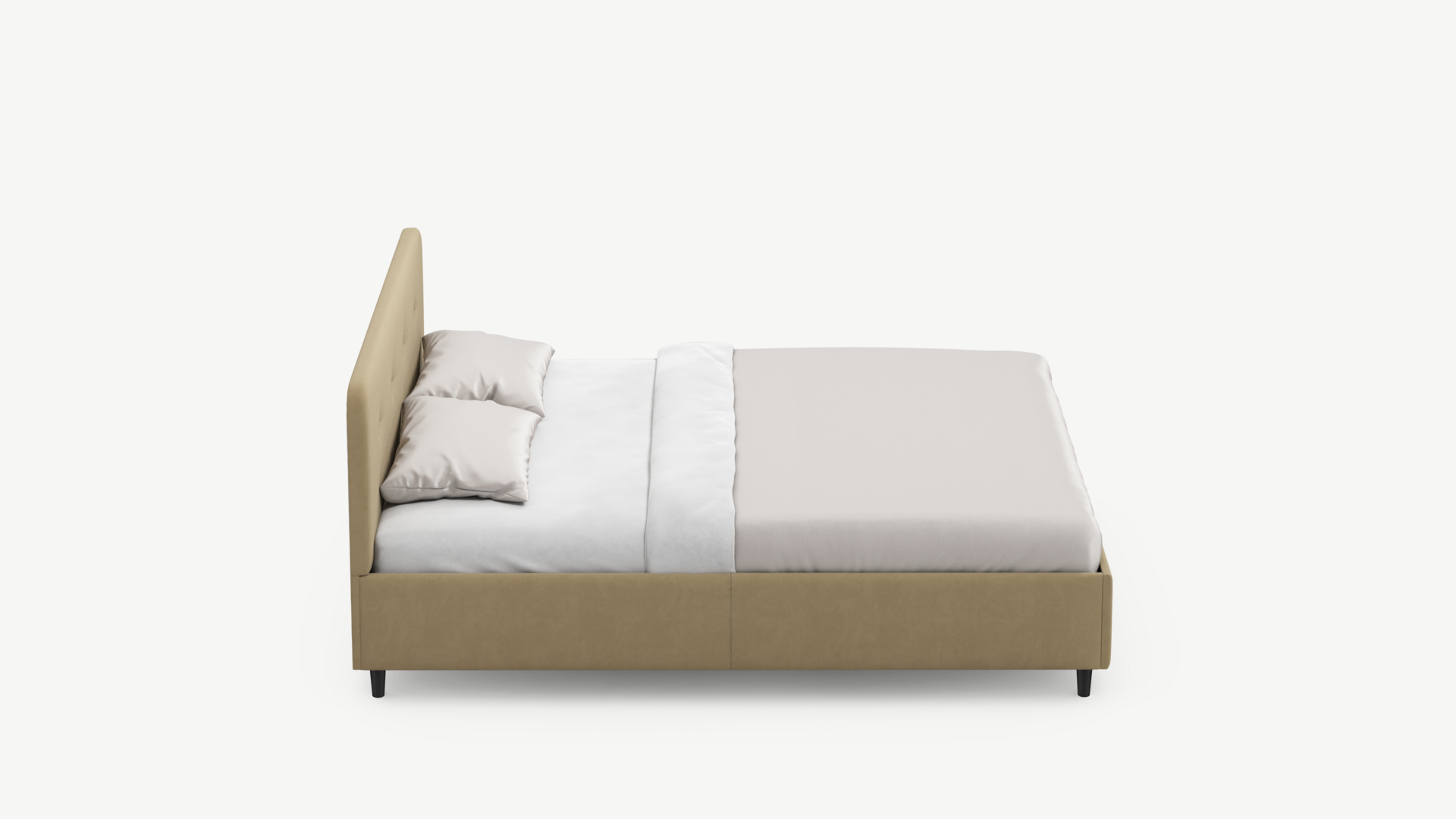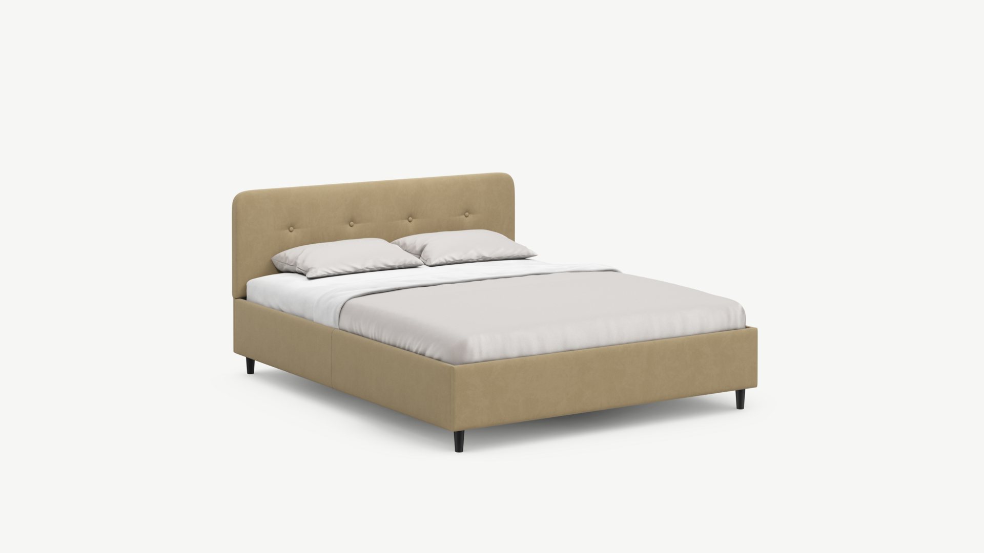 Царга, задающая пропорции, благодаря гладкости своей фактуры подчеркивает центральный элемент декора. Высокие опоры приподнимают фигуру кровати над полом и добавляют её образу визуальной легкости.