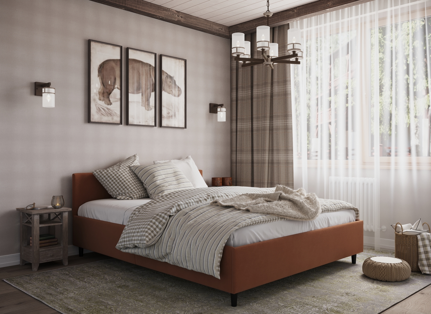 Создать гармоничный интерьер и завершить образ спальни помогут дополнительные аксессуары, например: тумбы, банкетки, подушки.