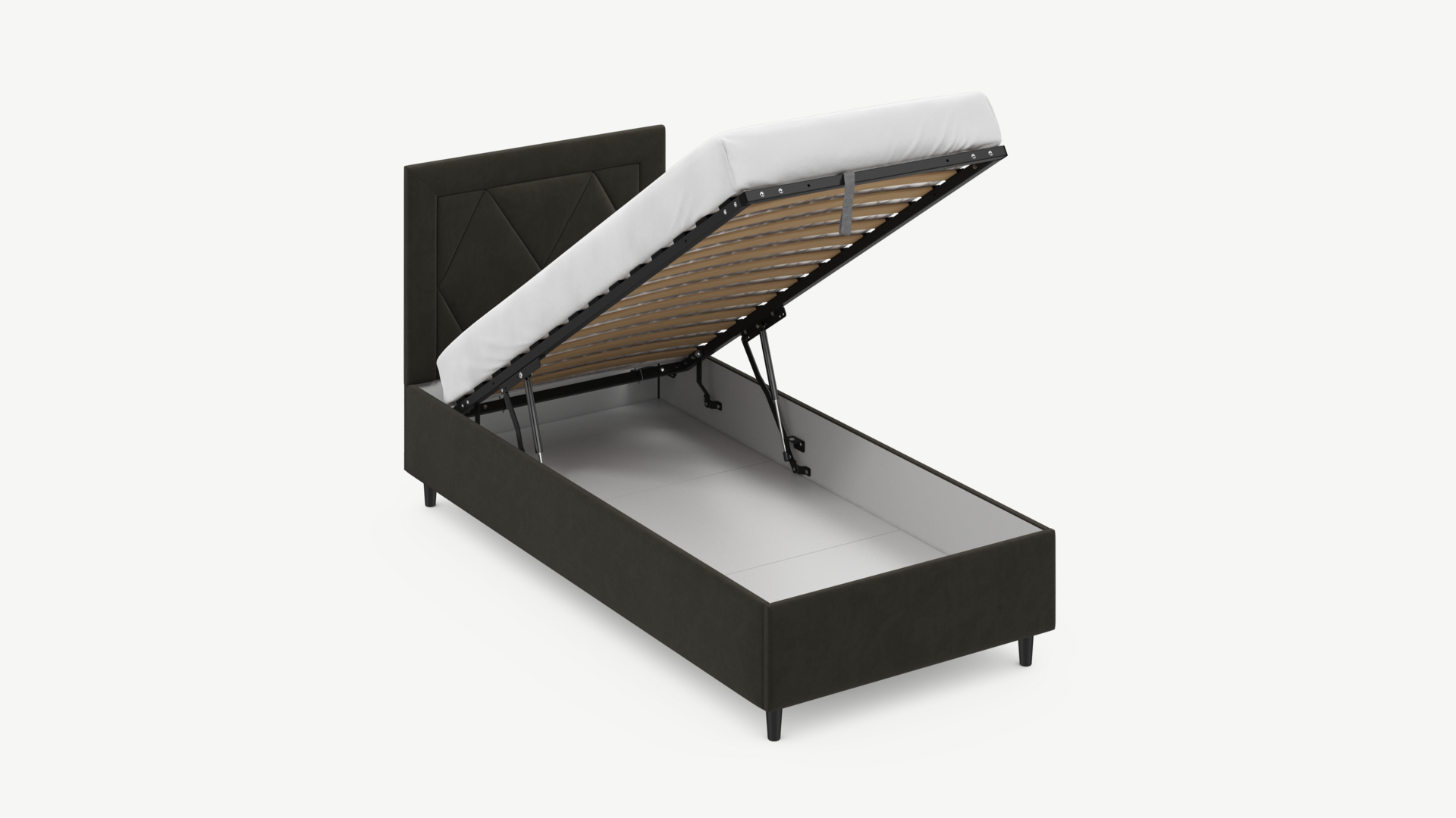 • Скрытая под основанием вместительная емкость без внутренних перегородок позволяет использовать всю площадь подкроватного пространства для хранения вещей.