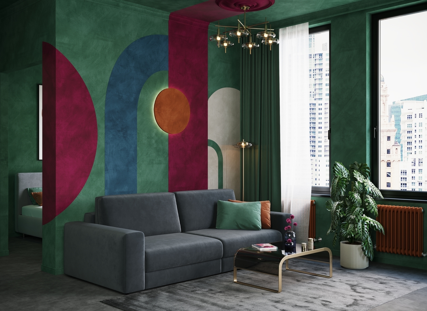 Спинка, выполненная в обивочной ткани, позволяет ставить диван в центре комнаты и зонировать пространство.