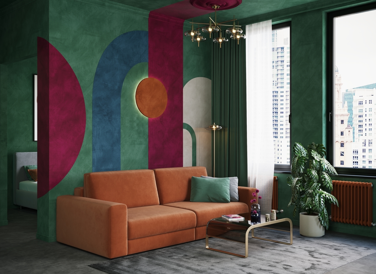 Спинка, выполненная в обивочной ткани, позволяет ставить диван в центре комнаты и зонировать пространство.