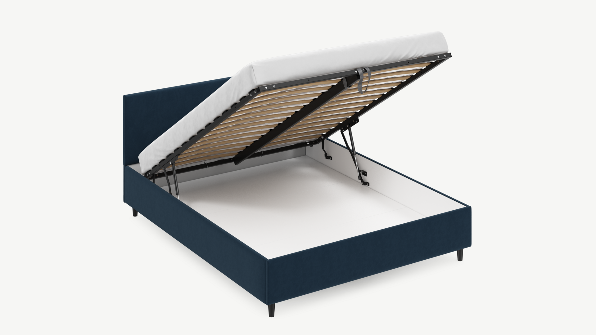• Скрытая под основанием вместительная емкость без внутренних перегородок позволяет использовать всю площадь подкроватного пространства для хранения вещей.