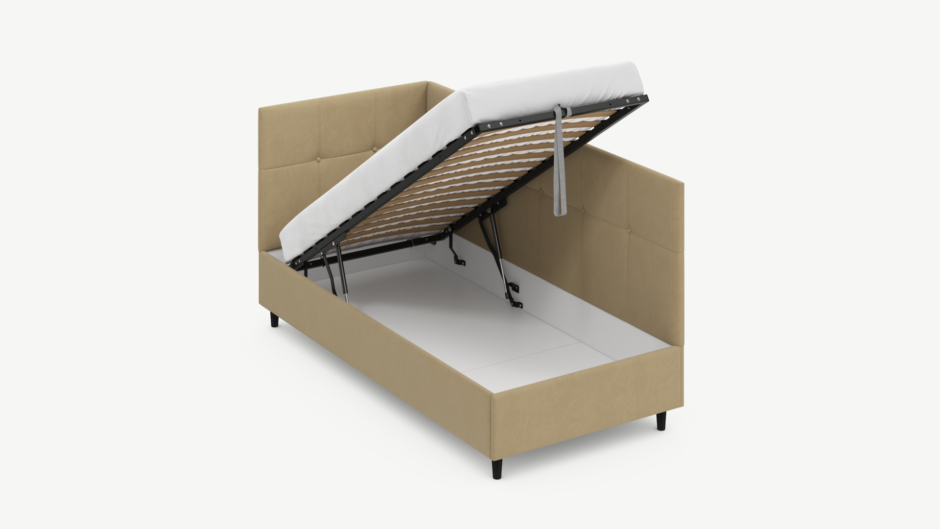 • Регулируемый подъемный механизм имеет два положения установки газовых амортизаторов в зависимости от веса матраса. Это дает возможность оптимально подстраивать угол подъема основания, а также плавно и бесшумно поднимать и опускать спальное место.