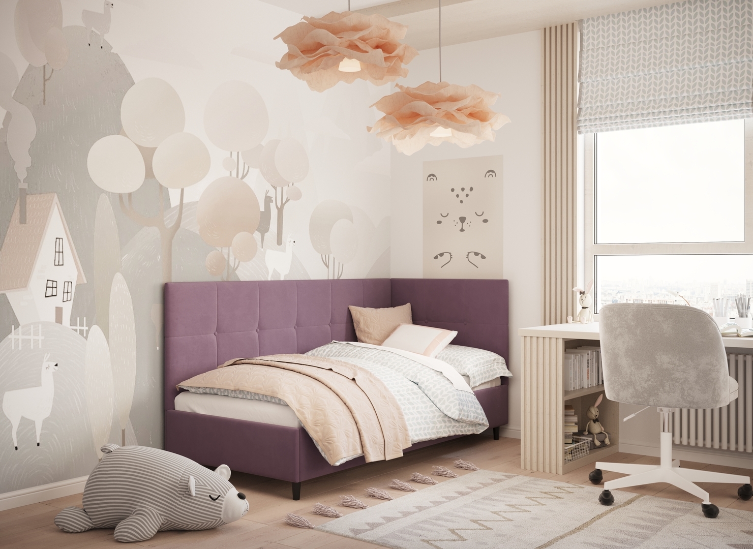Угловая односпальная кровать MOON FAMILY 1261 с мягкой спинкой и изголовьем создаст в Вашей спальне ощущение уюта. Крупная квадратная стежка привносит в интерьер графических акцентов, а вставка из пуговиц наполняет пространство ощущением домашнего тепла.