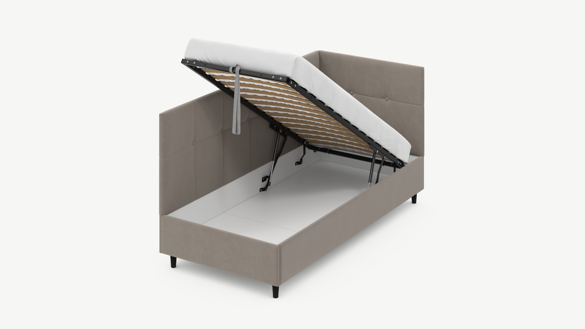 • Скрытая под основанием вместительная емкость без внутренних перегородок позволяет использовать всю площадь подкроватного пространства для хранения вещей.