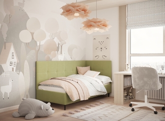 Угловая односпальная кровать MOON FAMILY 1261 с мягкой спинкой и изголовьем создаст в Вашей спальне ощущение уюта. Крупная квадратная стежка привносит в интерьер графических акцентов, а вставка из пуговиц наполняет пространство ощущением домашнего тепла.