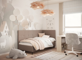 Угловая односпальная кровать MOON FAMILY 1261 с мягкой спинкой и изголовьем создаст в Вашей спальне ощущение уюта. Крупная квадратная стежка привносит в интерьер графических акцентов, а вставка из пуговиц наполняет пространство ощущением домашнего тепла.