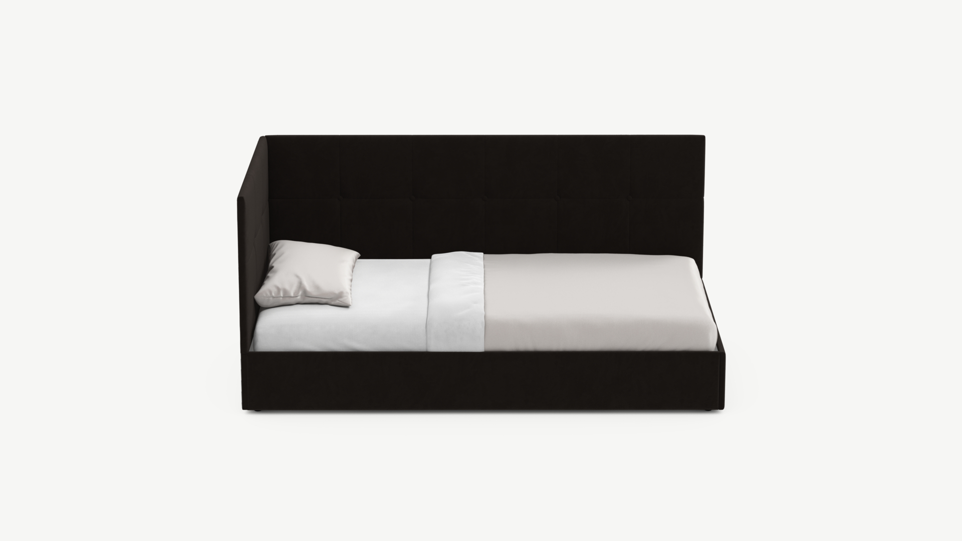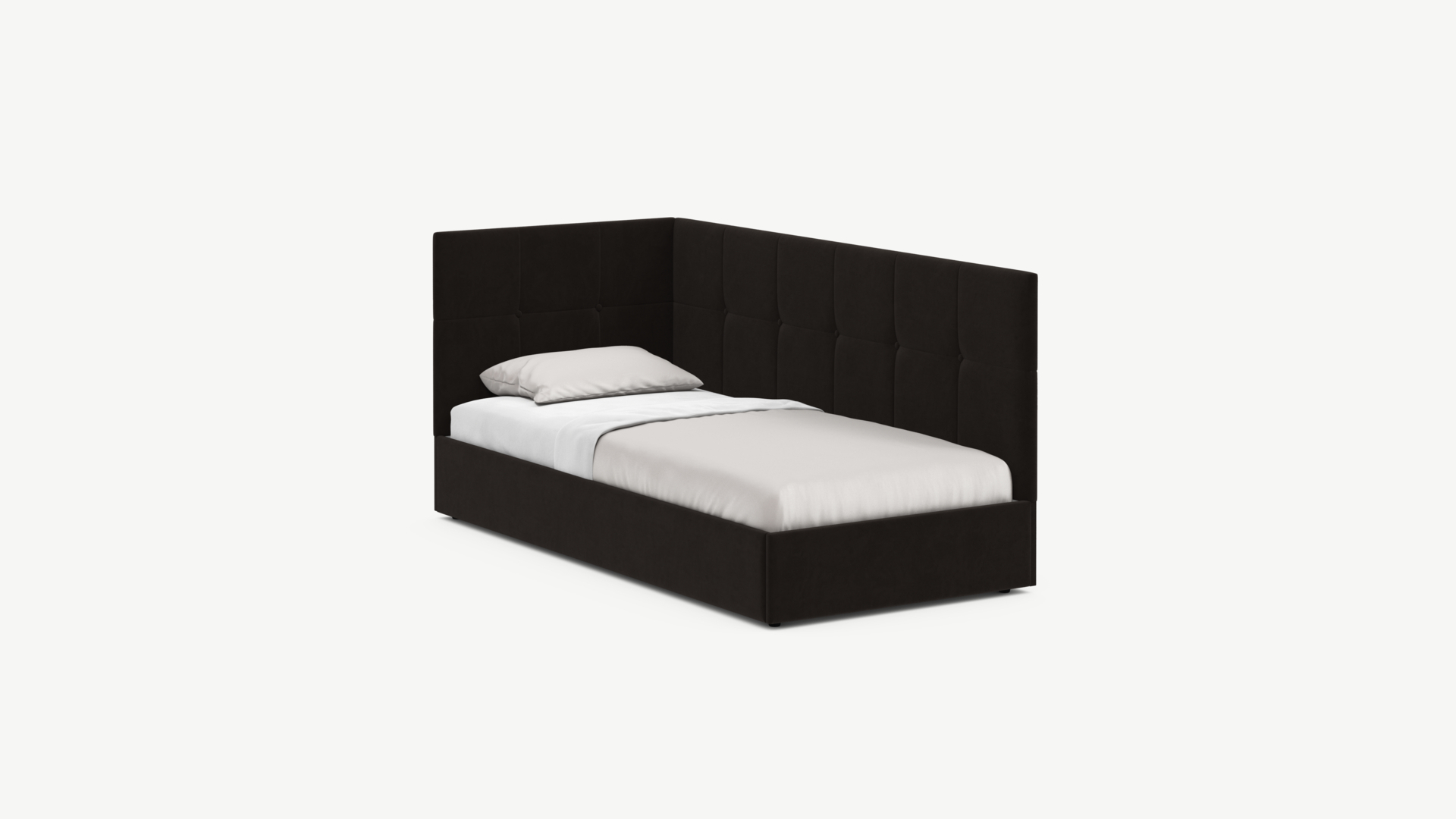 Угловая односпальная кровать MOON FAMILY 1261 с мягкой спинкой и изголовьем создаст в Вашей спальне ощущение уюта. Крупная квадратная стежка привносит в интерьер графических акцентов, а вставка из пуговиц наполняет пространство ощущением домашнего тепла.
