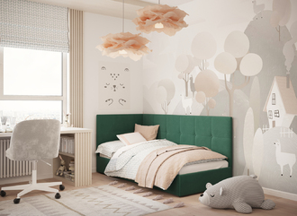 Угловая односпальная кровать MOON FAMILY 1261 с мягкой спинкой и изголовьем создаст в Вашей спальне ощущение уюта. Крупная квадратная стежка привносит в интерьер графических акцентов, а вставка из пуговиц наполняет пространство ощущением домашнего тепла.