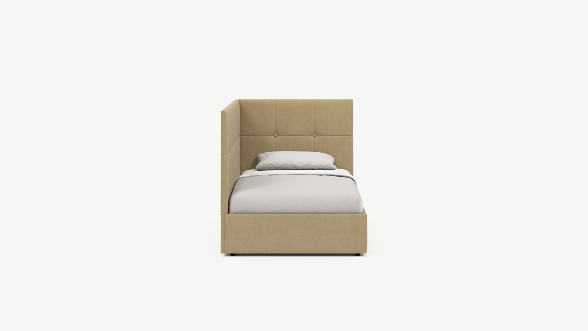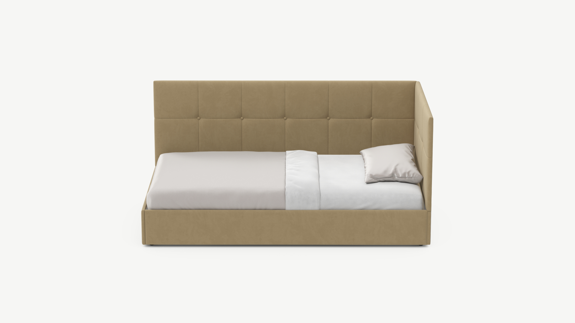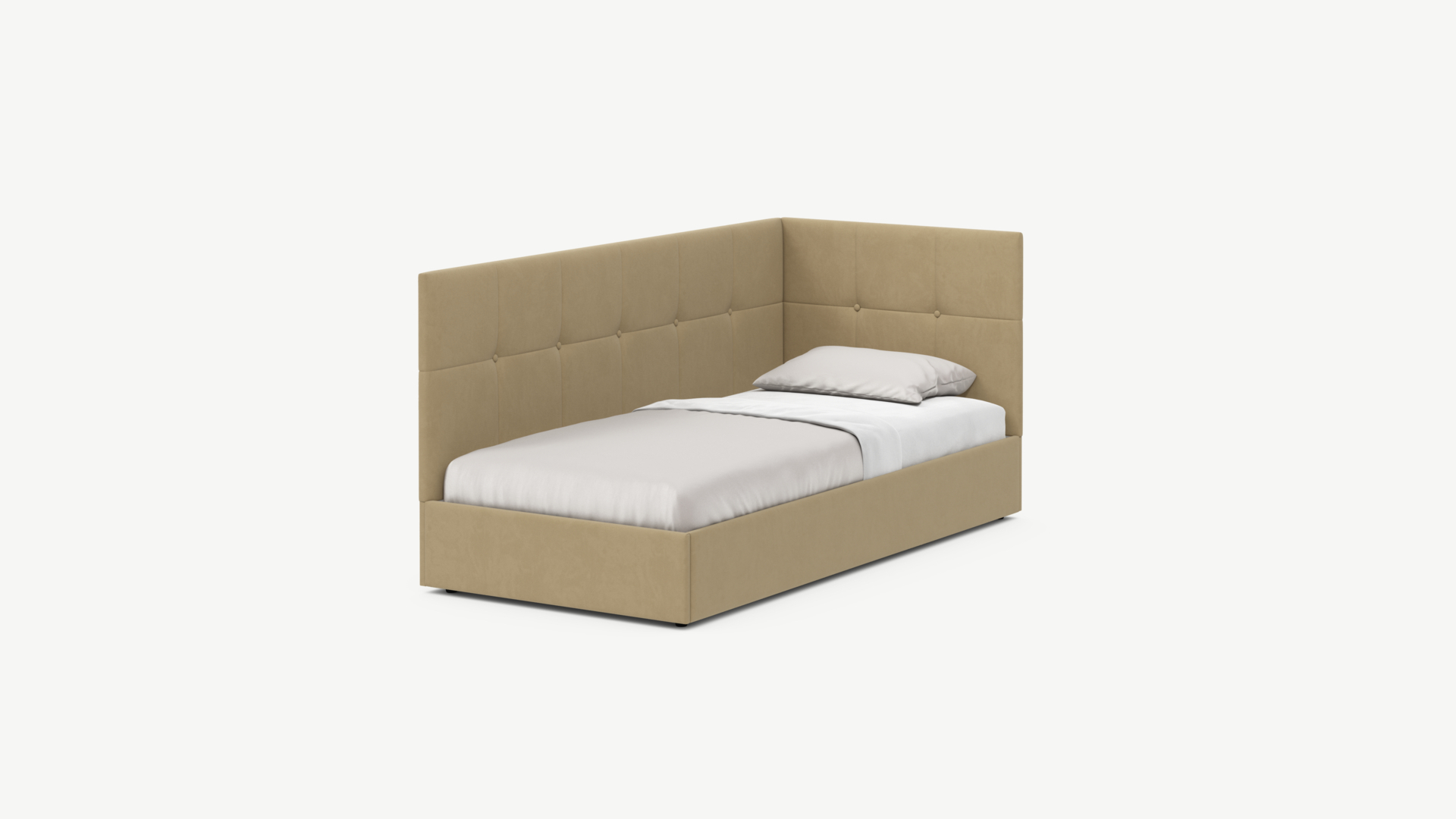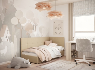 Угловая односпальная кровать MOON FAMILY 1261 с мягкой спинкой и изголовьем создаст в Вашей спальне ощущение уюта. Крупная квадратная стежка привносит в интерьер графических акцентов, а вставка из пуговиц наполняет пространство ощущением домашнего тепла.