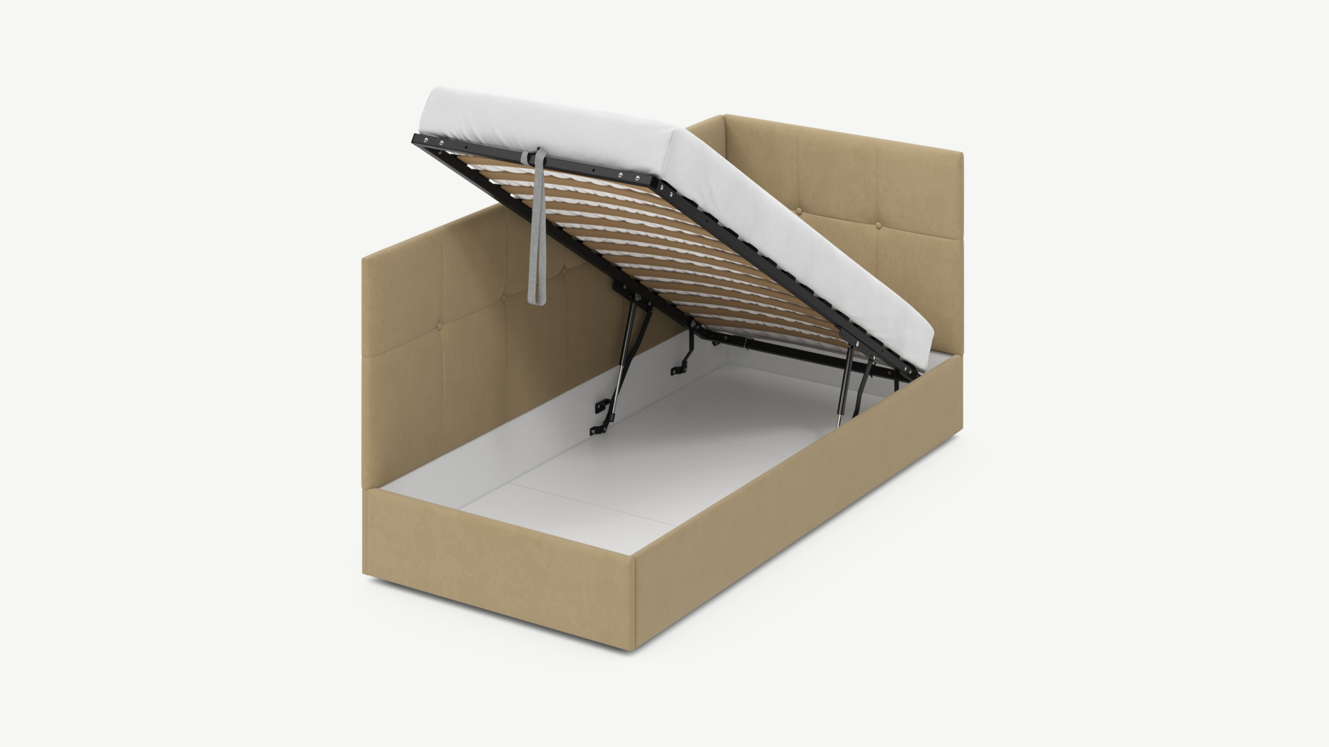 • Регулируемый подъемный механизм имеет два положения установки газовых амортизаторов в зависимости от веса матраса. Это дает возможность оптимально подстраивать угол подъема основания, а также плавно и бесшумно поднимать и опускать спальное место.