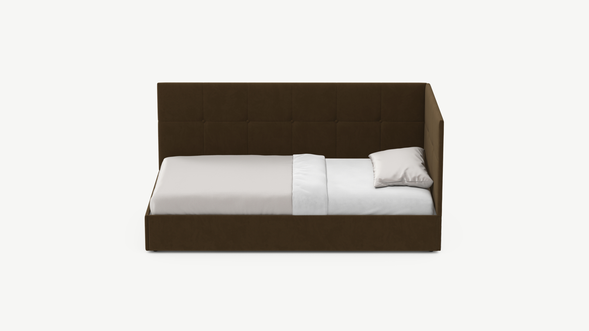 Угловая односпальная кровать MOON FAMILY 1261 с мягкой спинкой и изголовьем создаст в Вашей спальне ощущение уюта. Крупная квадратная стежка привносит в интерьер графических акцентов, а вставка из пуговиц наполняет пространство ощущением домашнего тепла.