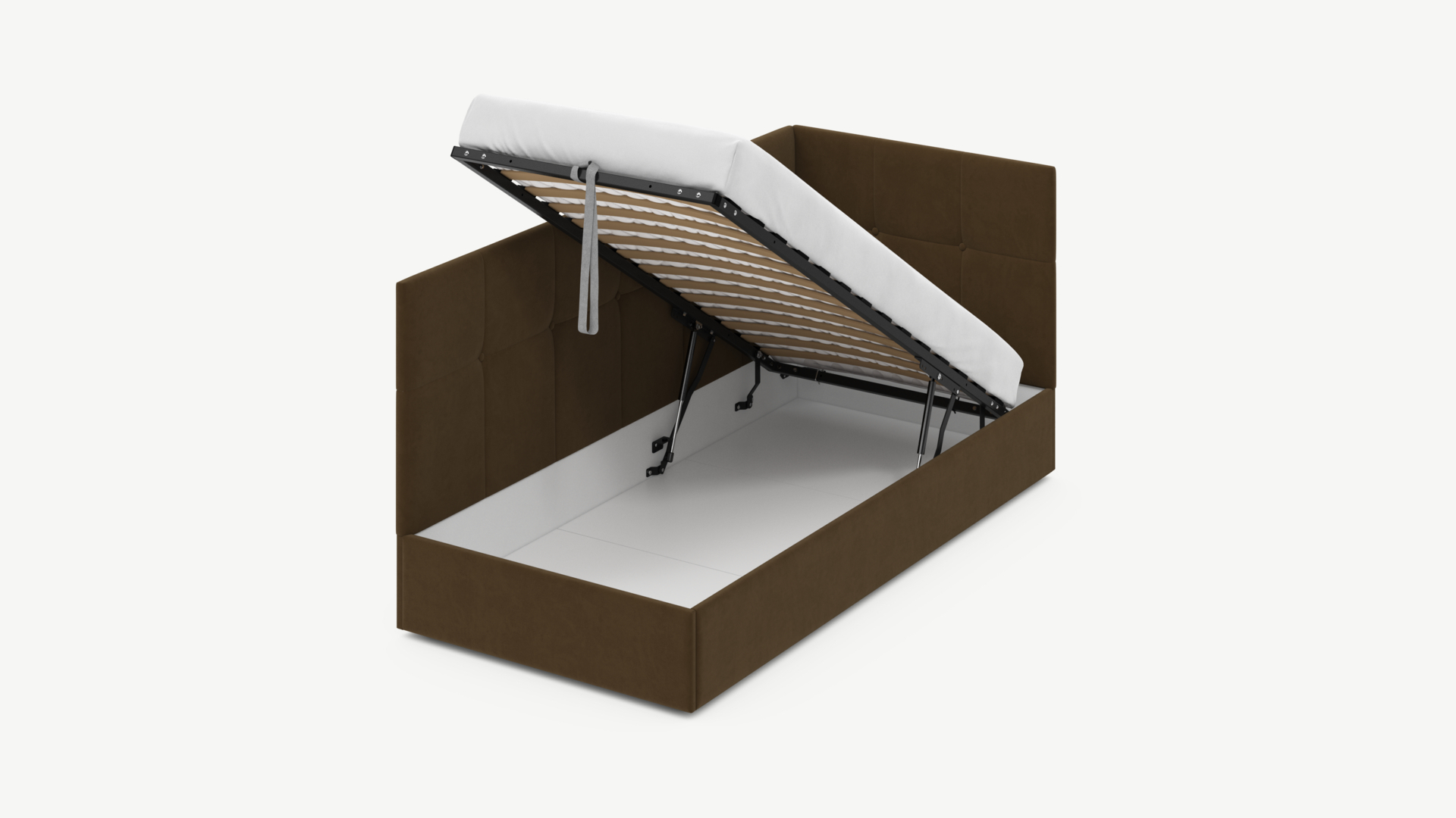 • Скрытая под основанием вместительная емкость без внутренних перегородок позволяет использовать всю площадь подкроватного пространства для хранения вещей.