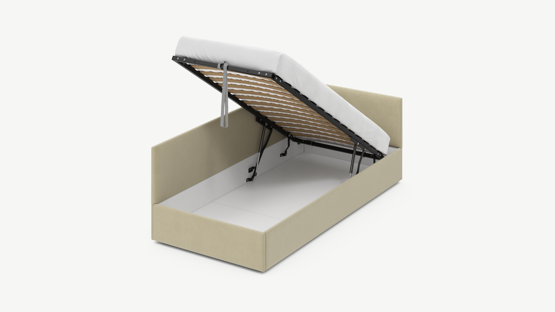 • Скрытая под основанием вместительная емкость без внутренних перегородок позволяет использовать всю площадь подкроватного пространства для хранения вещей.