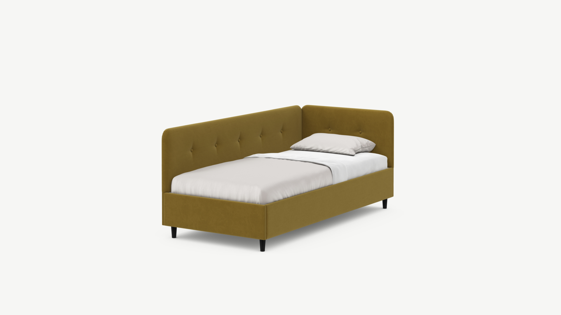 Угловая односпальная кровать MOON FAMILY 1253 с мягкой спинкой и изголовьем обладает округлыми формами, привносящими в интерьер нотки нежности. Изголовье, украшенное пуговицами, добавляет окружающему пространству шарм и уют. Высокие опоры придают кровати визуальной легкости, а также обеспечивают удобство во время уборки.