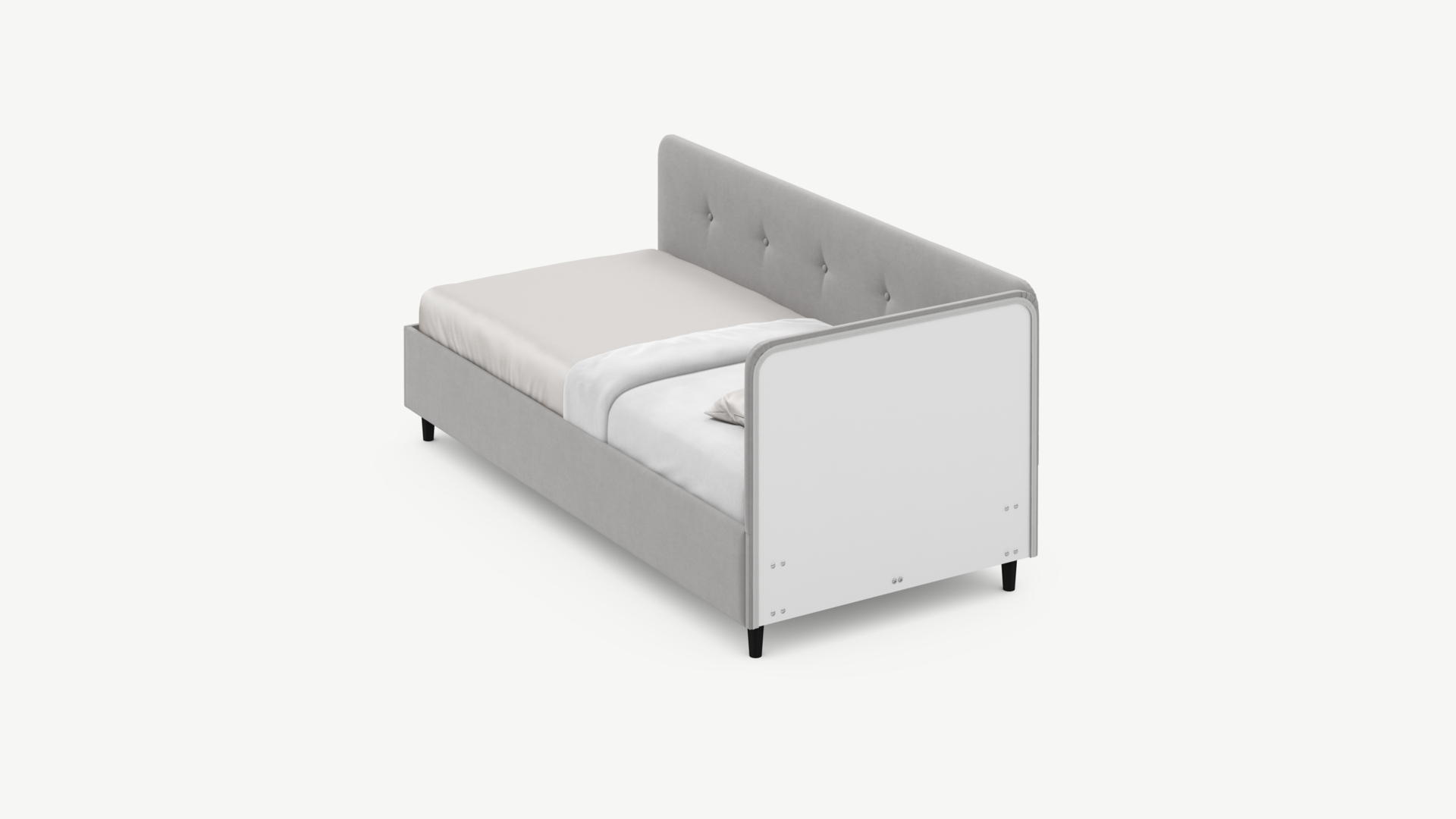 Угловая односпальная кровать MOON FAMILY 1253 с мягкой спинкой и изголовьем обладает округлыми формами, привносящими в интерьер нотки нежности. Изголовье, украшенное пуговицами, добавляет окружающему пространству шарм и уют. Высокие опоры придают кровати визуальной легкости, а также обеспечивают удобство во время уборки.