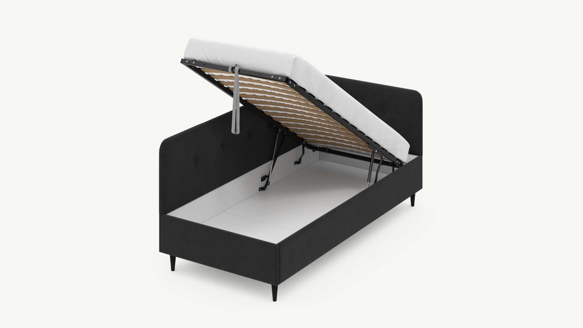 - Скрытая под основанием вместительная емкость без внутренних перегородок позволяет использовать всю площадь подкроватного пространства для хранения вещей.