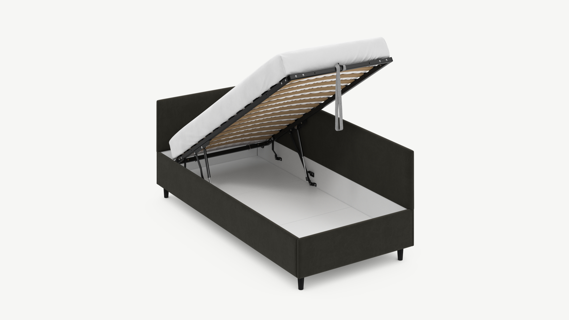 • Скрытая под основанием вместительная емкость без внутренних перегородок позволяет использовать всю площадь подкроватного пространства для хранения вещей.