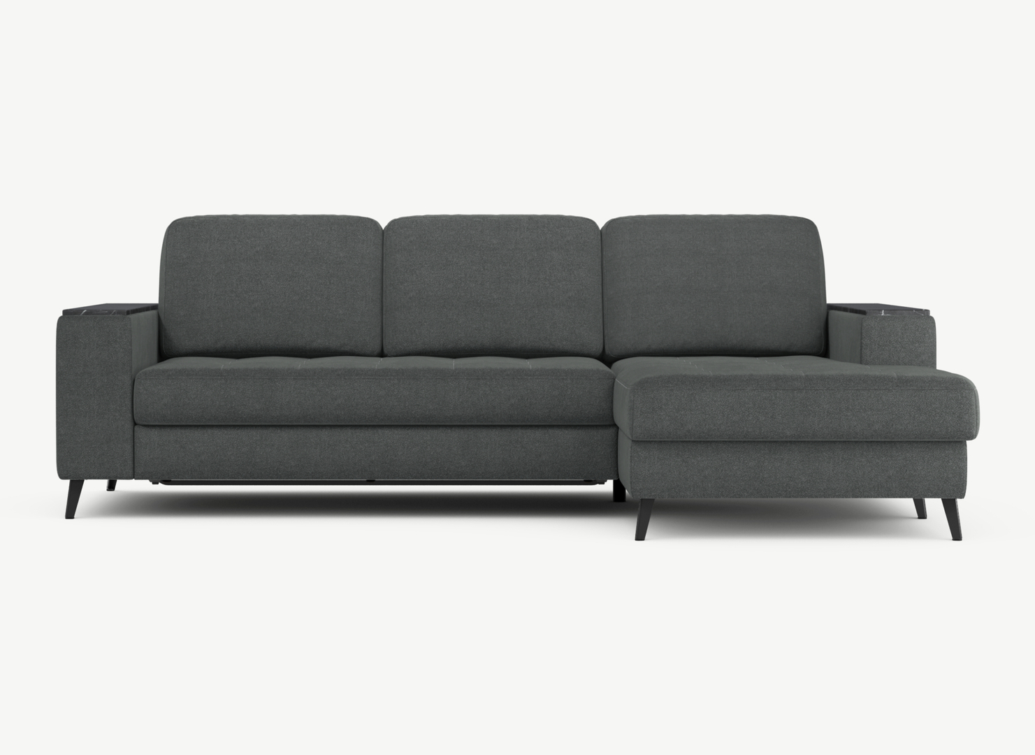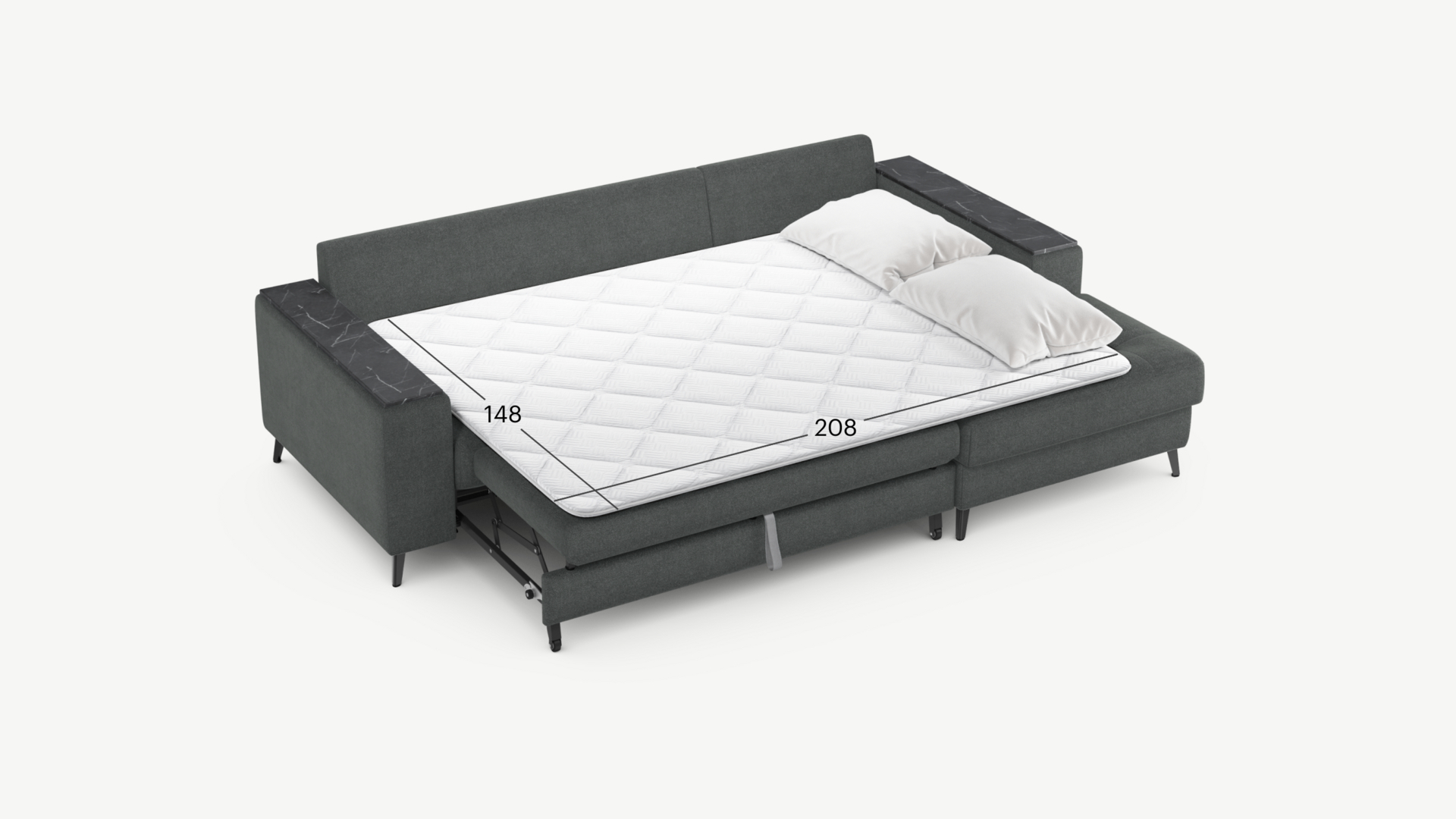 Секция «канапе» обеспечивает дополнительное пространство для отдыха, благодаря которому Вы можете располагаться с максимальным комфортом, удобно вытянув ноги. Под данной секцией расположен вместительный бельевой короб.