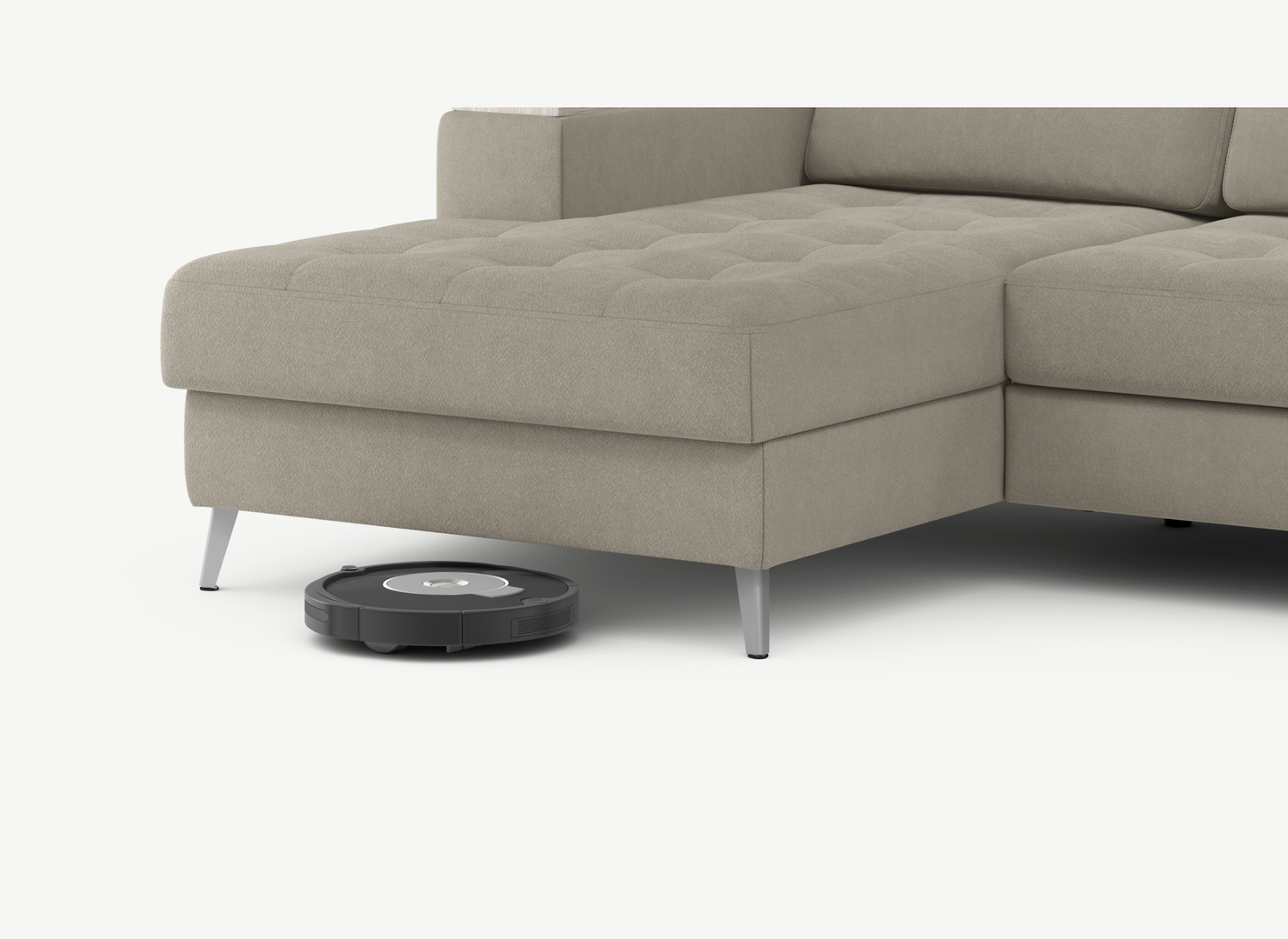 Благодаря высоким наклонным опорам под диваном проходит робот-пылесос и легко проводится влажная уборка, что обеспечивает чистоту и порядок в доме.