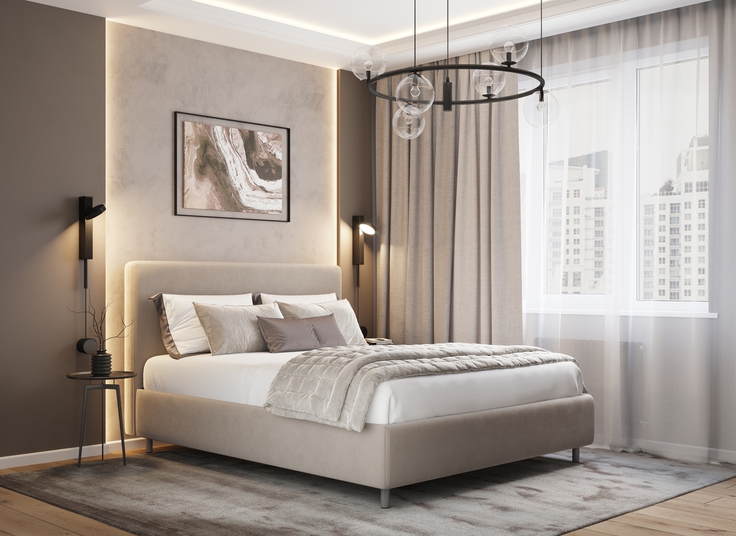 Творческий подход к выбору обивочного материала меняет образ дизайна. Велюр за счет своей бархатистой фактуры привносит в пространство шика и утонченности. Шенилл дополняет оформление спальни природными текстурами, создавая атмосферу тепла и уюта.