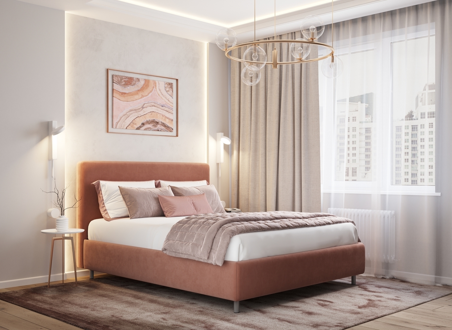 Творческий подход к выбору обивочного материала меняет образ дизайна. Велюр за счет своей бархатистой фактуры привносит в пространство шика и утонченности. Шенилл дополняет оформление спальни природными текстурами, создавая атмосферу тепла и уюта.