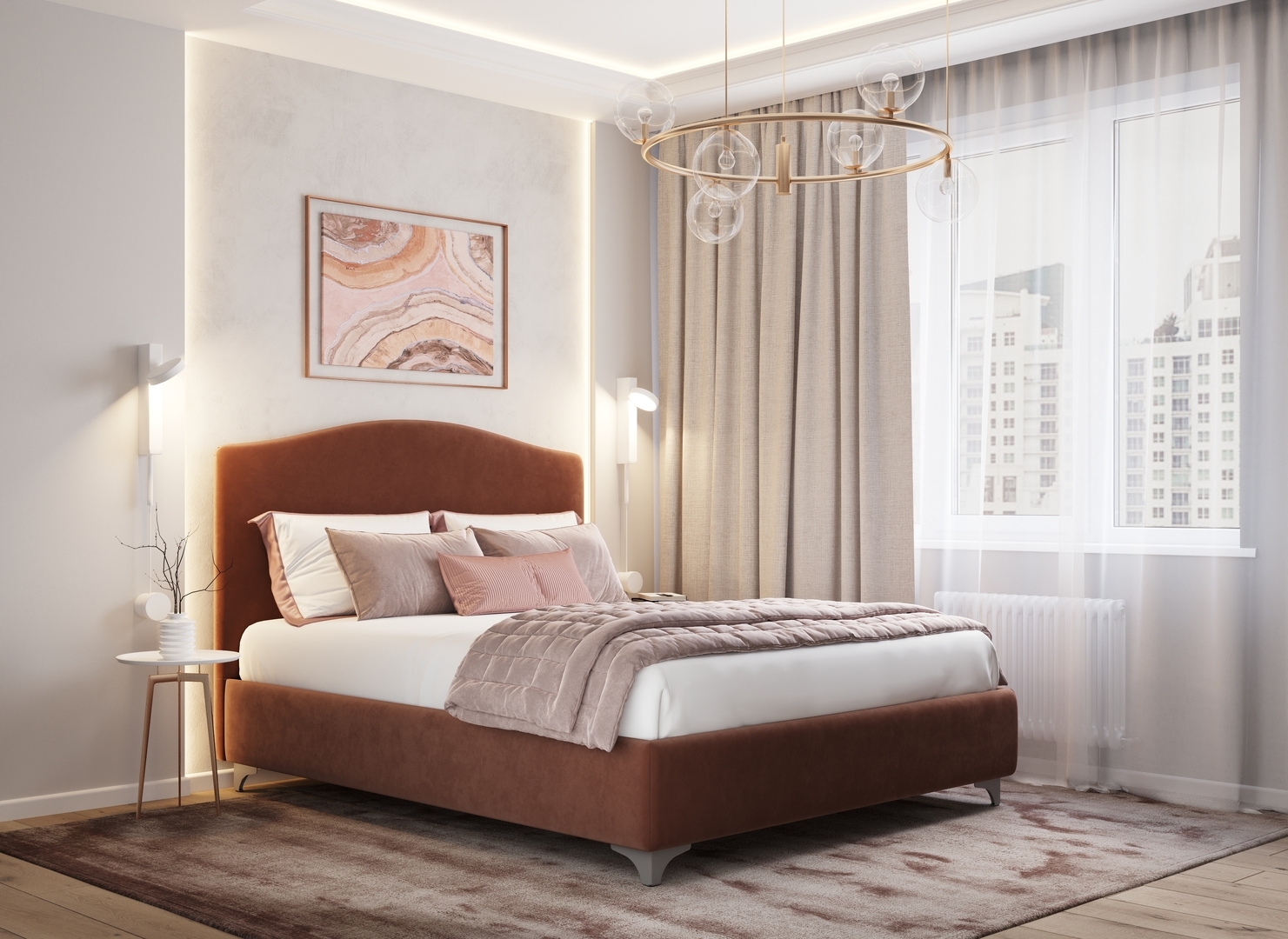 Разнообразие цветовой палитры позволит подобрать желаемый оттенок обивочного материала. Использование светлых цветов поддержит настроение стиля «Сканди». Нейтральные оттенки в цвет интерьера обыграют спальню в Современном стиле.