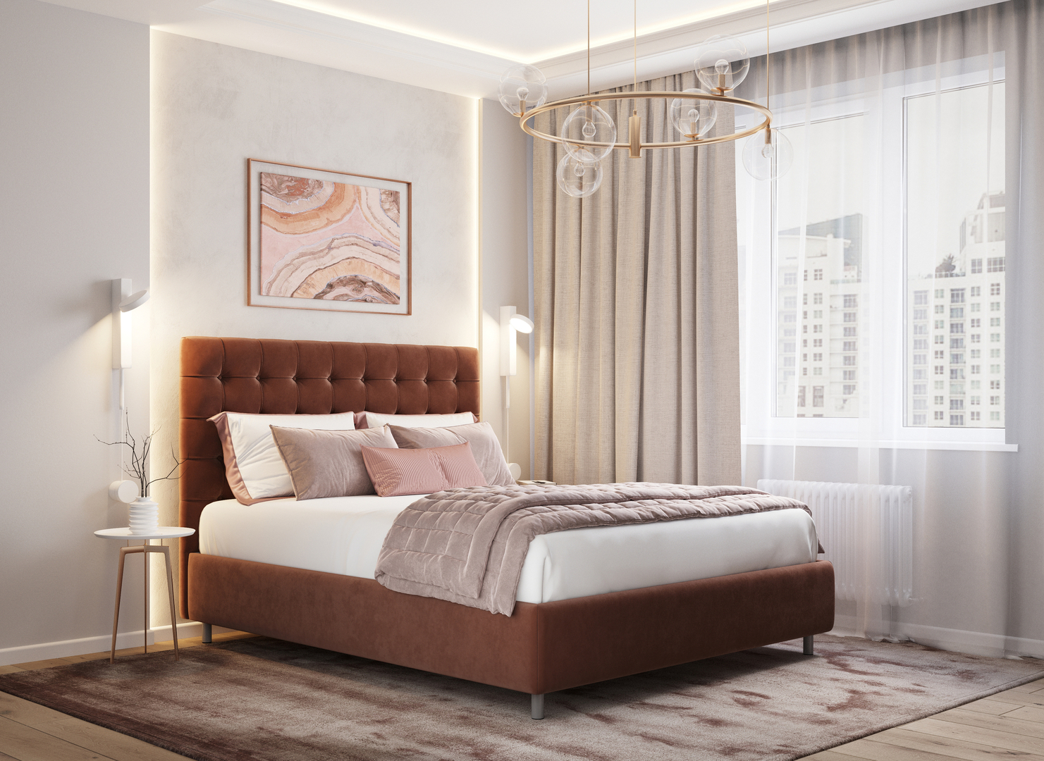 Творческий подход к выбору обивочного материала меняет образ дизайна. Например, однотонный гладкий велюр придает кровати эстетическую утонченность, в то время как фактурное тиснение на ткани усиливает игру перехода оттенков и выглядит особенно оригинально. Оформите образ кровати, выбирая обивку, которая подчеркнет звучание Вашей спальни и отразит Ваш вкус.